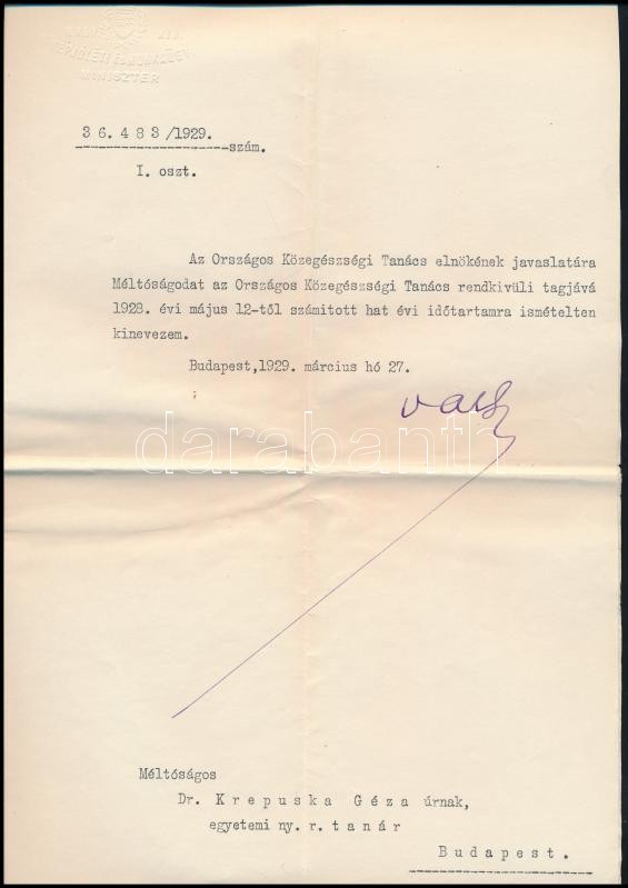 1929 Vass József (1877-1930) népjóléti miniszter által saját kezűleg a... https://www.darabanth.com/de/413-Fernauktion/413.0/Kunst-Dokumente-andere-Sammelgebiete/Dokument~500018/1929-Vass-Jozsef-1877-1930-nepjoleti-miniszter-altal-sajat-kezuleg-alairt-kinevezesi-okm~II2581595