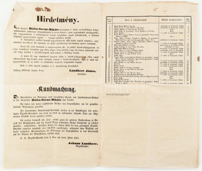 Beschreibung: 1853 Rábaszentmiklós község kezdeti telekkönyvi összeírása. A helyi birtokosok névjegyzéke és hirdetmény a jelentkezésre. 48x41 cm