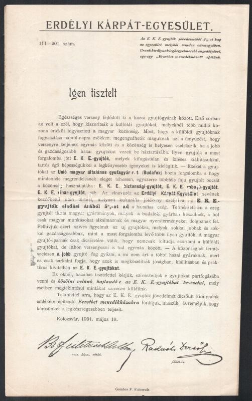 1901 Kolozsvár, az Erdélyi Kárpát-Egyesület (EKE) körlevele az Unió gyufagyár által forgalomba hozott EKE-gyújtók tárgyában, nyomtatott aláírásokkal, kitöltetlen