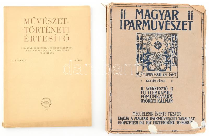 1909 Magyar Iparművészet XII. évf. 6-7. sz., számos fekete-fehér fotóval, korabeli hirdetésekkel, sérült, foltos + 1956 Művészettörténeti Értesítő IV. évf. 4. sz., fekete-fehér fotókkal, kissé sérült, megjelent 2200 példányban