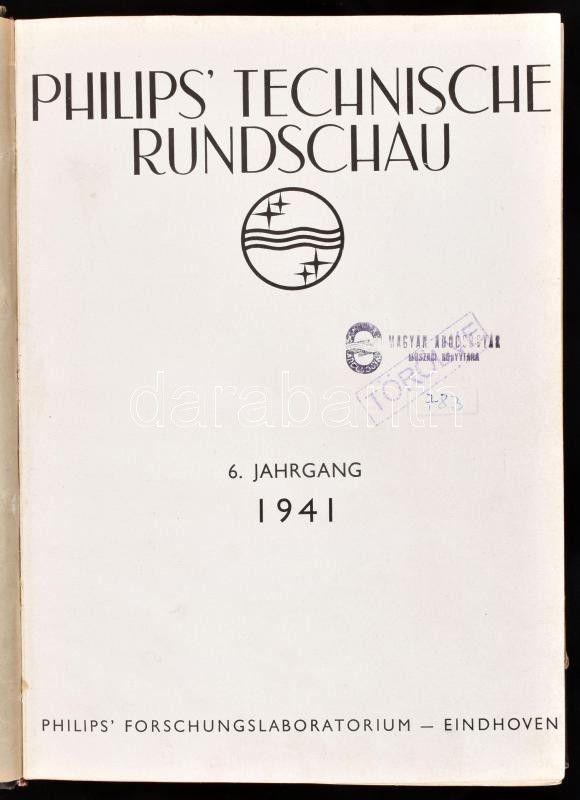 1941 Philips' Technische Rundschau 6. Jahrgang / német nyelvű műszaki folyóirat teljes évfolyama egybekötve (1941. jan.-dec.), fekete-fehér képekkel illusztrált, sérült félvászon-kötésben, hiányzó gerinccel