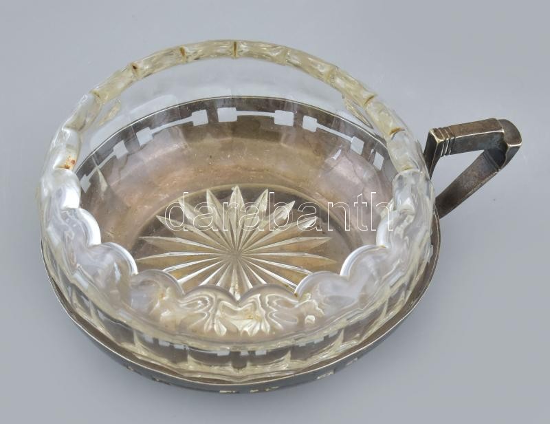 Beschreibung: Alpakka kis füles kínáló/csészetartó, nem hozzá való csiszolt üvegbetéttel. Jelzett (Hacker), kisebb kopásnyomokkal, d: 10,5 cm