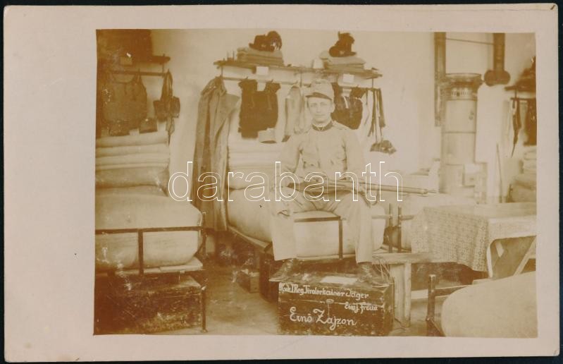 1915 A k.u.k. I. Reg. Tirolerkaiser Jäger (hegyivadász) Zajzon Ernő önkéntes katona a laktanyai szobában felszerelésével, fotó szép állapotban, 9×14 cm