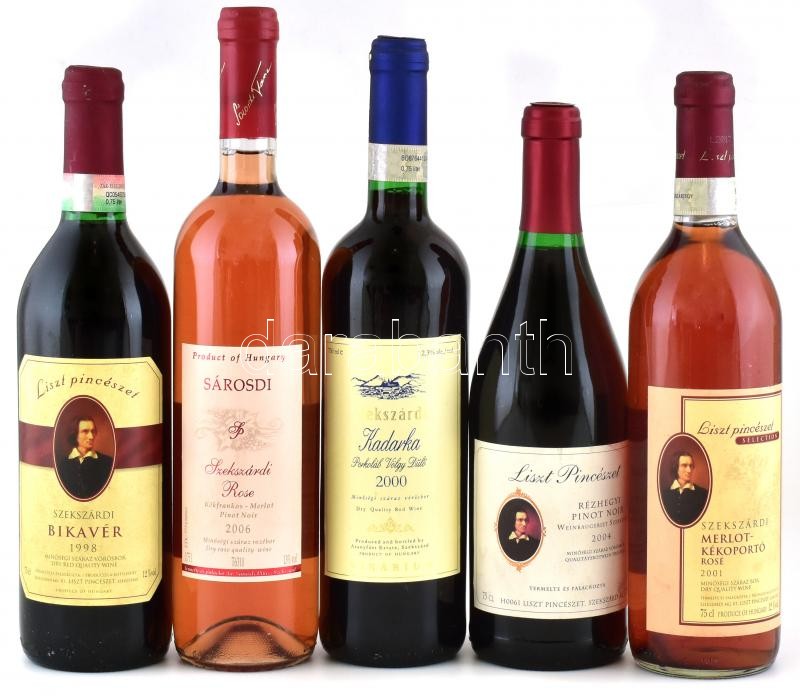 1998-2006 Vegyes szekszárdi bor tétel, 5 db, Liszt Szekszárdi Bikavér 1998, Liszt Rézhegyi Pinot Noir 2004, Liszt Szekszárdi Merlot-Kékoportó Rozé 2001, Sárorsd Szekszárdi Rosé (Kékfrankos-Merlot-Pinot Noir) 2006, Aranyfürt Szekszárdi Kadarka Porkoláb Völgy Dűlő 2000. Bontatlan palackok, 0,75 l.