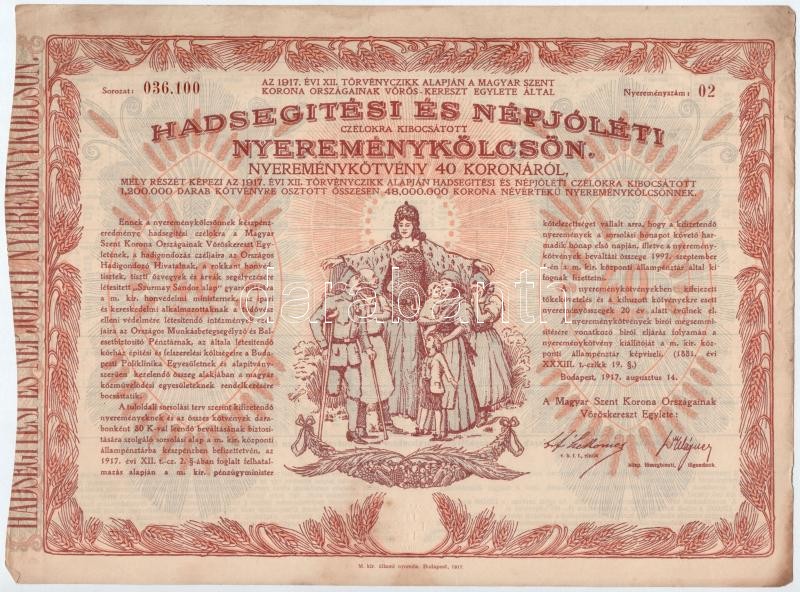 Beschreibung: Budapest 1917. "Hadsegítési és Népjóléti nyereménykölcsön" nyereménykötvény 40K-ról, szárazpecséttel T:II hajtatlan, folt, kis szakadás