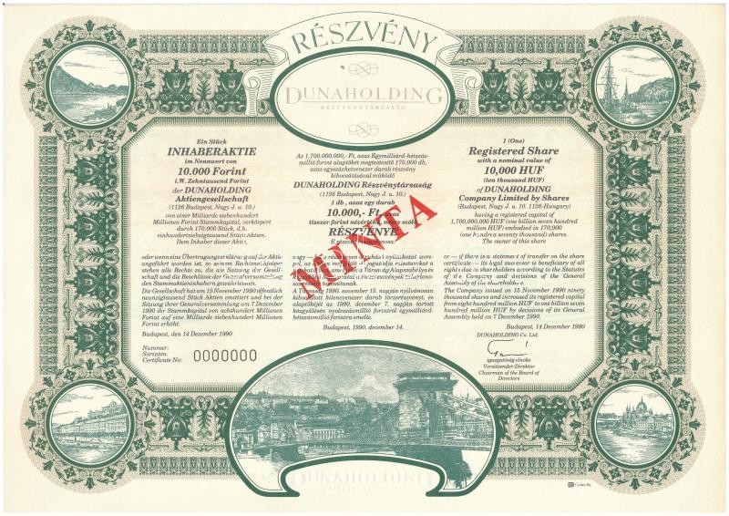 Budapest 1990. "Dunaholding Részvénytársaság" "MINTA" részvénye 10.000... https://www.darabanth.com/de/413-Fernauktion/413.0/Numismatik/Aktien-und-Tickets~1500005/Budapest-1990-Dunaholding-Reszvenytarsasag-MINTA-reszvenye-10000Ft-rol-szelvenyekkel-~II2581763