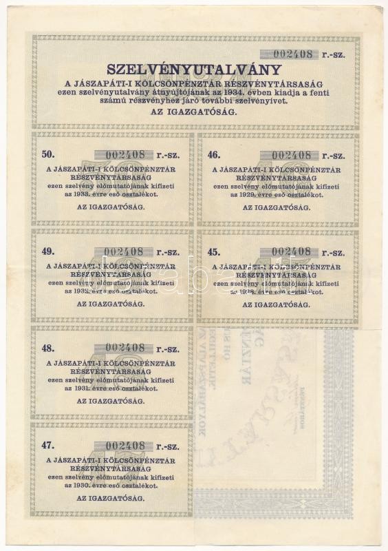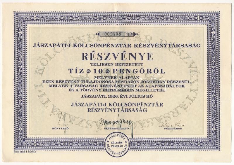 Jászapáti 1926. "Jászapáti-i Kölcsönpénztár Részvénytársaság" részvény... https://www.darabanth.com/de/413-Fernauktion/413.0/Numismatik/Aktien-und-Tickets~1500005/Jaszapati-1926-Jaszapati-i-Kolcsonpenztar-Reszvenytarsasag-reszvenye-10P-rol-szelv~II2574794