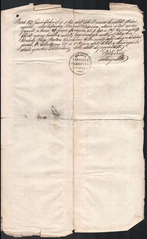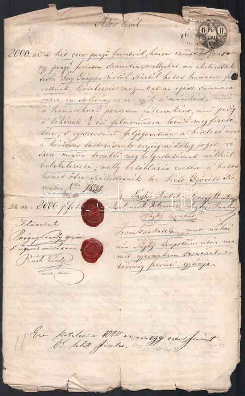 1858-1869 Győr, adóslevél 2000 forintról a Zombath és Sághy családok k... https://www.darabanth.com/de/413-Fernauktion/413.0/Philatelie-und-Postgeschichte-Ungarn/Stempelmarken~500017/1858-1869-Gyor-adoslevel-2000-forintrol-a-Zombath-es-Saghy-csaladok-kozott-2-viaszpecset~II2577324