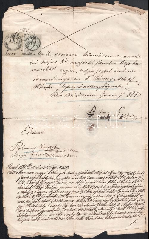 Beschreibung: 1858-1869 Győr, adóslevél 2000 forintról a Zombath és Sághy családok között, 2 viaszpecséttel, Komárom Vármegye Telekkönyvi Hivatali pecsétekkel,