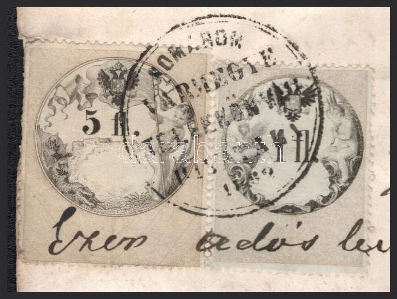 6 fl., 5 fl., 1 fl. okmánybélyegekkel, szakadozott.