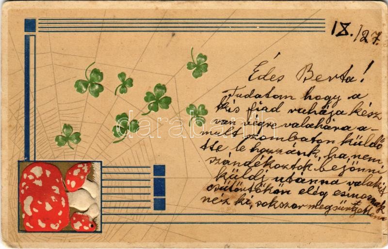 1909 Greeting art postcard with mushroom, clovers and spider web. &quo... https://www.darabanth.com/de/414-Fernauktion/414.0/Ansichtskarten/GruC39Fkarten-Feste~1500085/1909-Greeting-art-postcard-with-mushroom-clovers-and-spider-web-ERIKA-Nr-3459-Art-Nouveau-Emb~II2595741