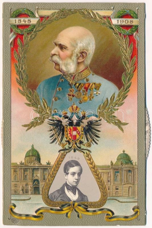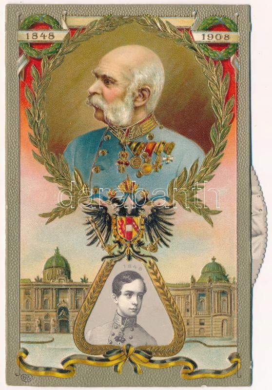 1848-1908 Ferenc József uralkodásának 60. évfordulója. Jubileumi díszes, szecessziós, dombornyomott litho mechanikus lap (nem rögzített belső rész!) / Franz Joseph's 60th anniversary of reign. Art Nouveau, Emb. litho mechanical postcard (not fixed inside!)