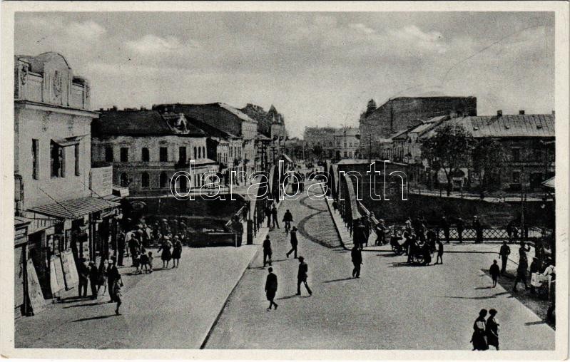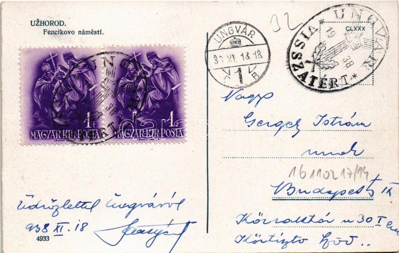 Beschreibung: Ungvár, Uzshorod, Uzhhorod, Uzhorod; Fencikovo námestí / tér, híd, üzletek / square, bridge, shops + "1938 Ungvár visszatért" So. Stpl.