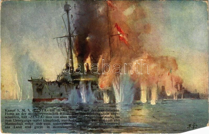 1915 Kampf SMS Zenta am 16. August 1914 mit der französischen Flotte an der montenegrischen Küste. K.u.K. Kriegsmarine. Offizielle Karte für Rotes Kreuz. Kriegsfürsorgeamt Kriegshilfsbüro Nr. 30. / WWI Austro-Hungarian Navy art postcard. The downfall of SMS Zenta protected cruiser, after getting trapped by seventeen French and British naval units consisting of battleships and armoured cruisers (EM)