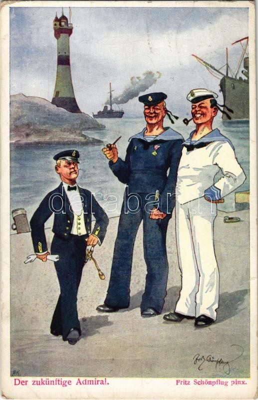 1918 Der zukünftige Admiral. K.u.K. Kriegsmarine / WWI Austro-Hungarian Navy humour art postcard, mariners and admiral. Österr. Flottenverein Serie IV. Nr. 1. s: Fritz Schönpflug (EK)