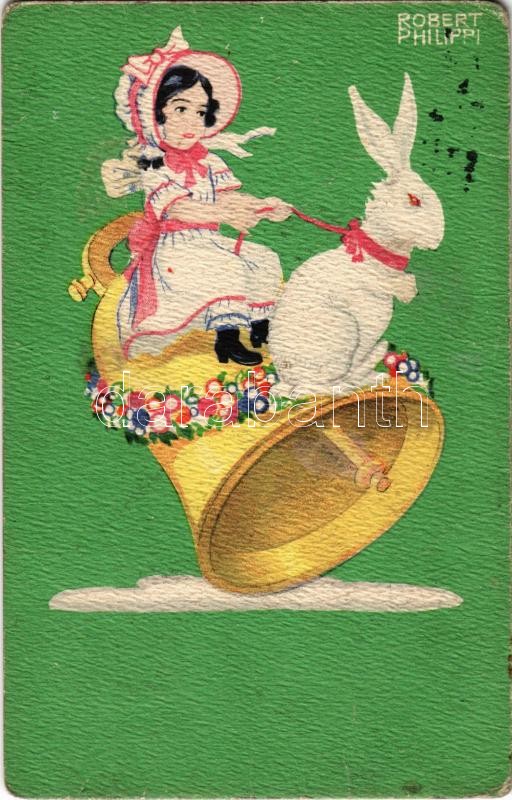 Beschreibung: 1916 Easter greeting art postcard, girl with rabbit and bell. B.K.W.I. 4638-4. s: Robert Philippi (kopott sarkak / worn corners)
