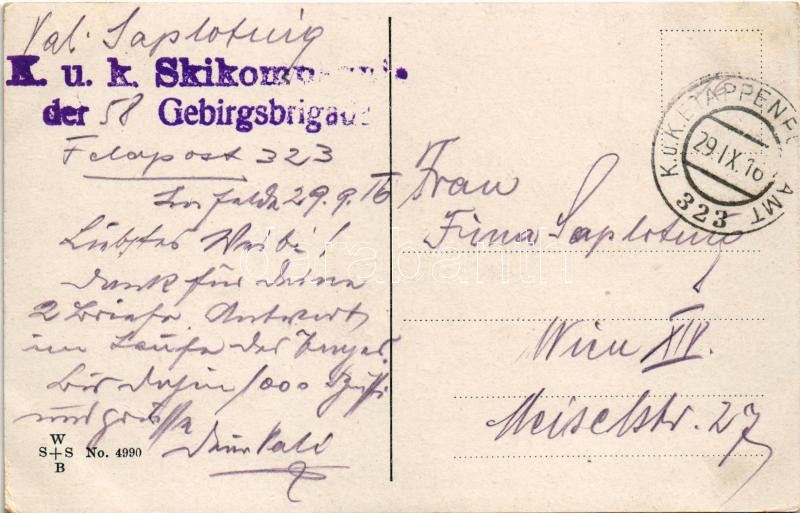 Beschreibung: 1916 Soldatenleben, das heißt lustig sein / WWI German military art postcard. WSSB No. 4990. s: Ad. Hoffmann + "K.u.K. Skikompagnie der 58. Gebirgsbrigade" (EK)