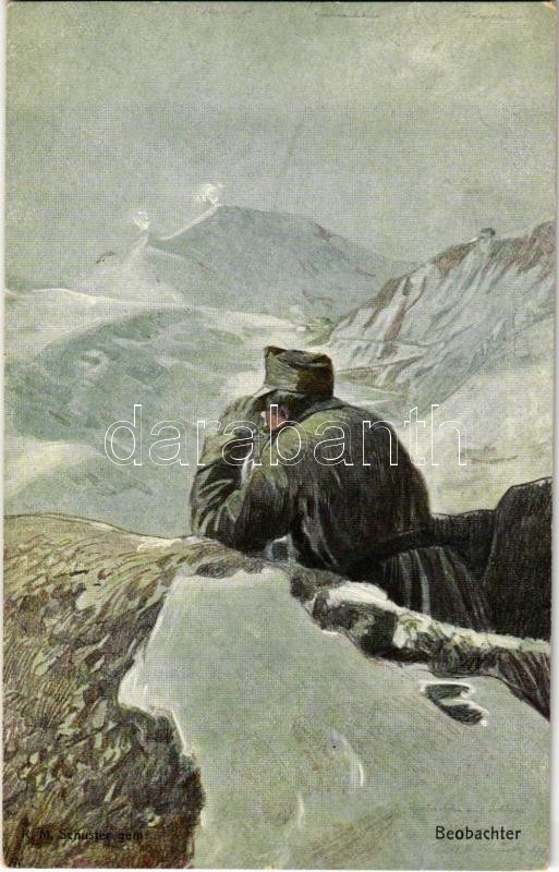 Beobachter. Offizielle Karte für Rotes Kreuz, Kriegsfürsorgeamt Kriegshilfsbüro Nr. 564. / WWI Austro-Hungarian K.u.K. military art postcard, mountain infantry, observer s: K. M. Schuster (EK)
