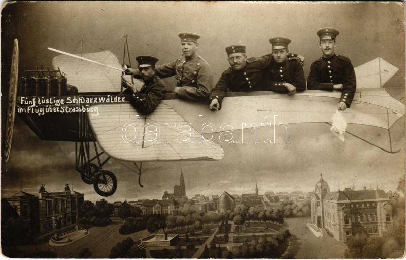 Fünf lustige Schwarzwälder im Flug über Strassburg / WWI German milita... https://www.darabanth.com/de/414-Fernauktion/414.0/Ansichtskarten/Militaria~1500068/Funf-lustige-Schwarzwalder-im-Flug-uber-Strassburg-WWI-German-military-soldiers-humour-Juliu~II2590045