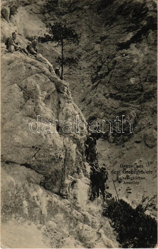 Grüss aus dem Grenzgebiete. Kaiserschützen, Anseilen / WWI Austro-Hung... https://www.darabanth.com/de/414-Fernauktion/414.0/Ansichtskarten/Militaria~1500068/Gruss-aus-dem-Grenzgebiete-Kaiserschutzen-Anseilen-WWI-Austro-Hungarian-KuK-military-mount~II2588393