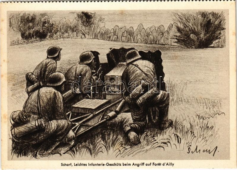 Leichtes Infanterie-Geschütz beim Angriff auf Foret d'Ailly. Soldatenkalender 1941 / WWII German military art postcard. Zentral-Verlag der NSDAP (German Nazi Party) s: Scharf