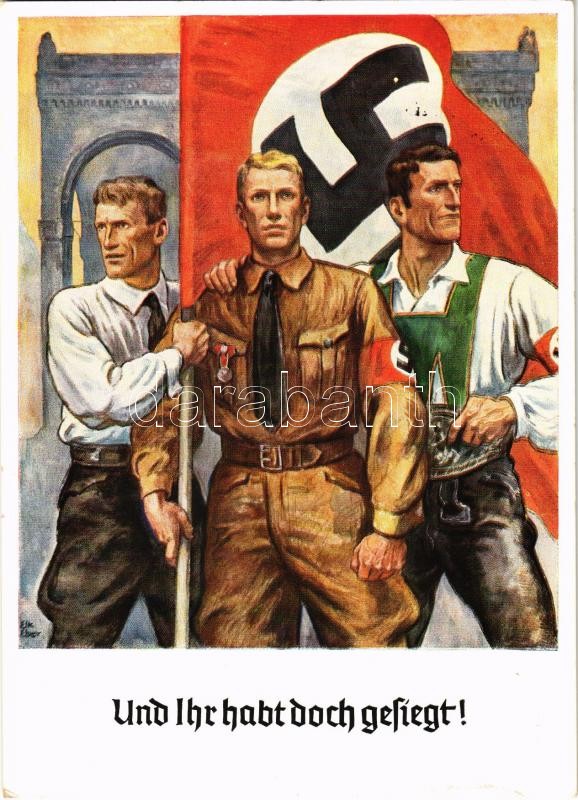 Und Ihr habt doch gesiegt! Offizielle Erinnerungspostkarte zum 9. November 1938 / WWII German Nazi military propaganda + "1938 München Hauptstadt der Bewegung" So. Stpl s: Elk Eber
