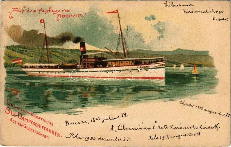 1901 A Magyar-Horvát Tengeri Gőzhajózási Rt. "Liburnia" egyc... https://www.darabanth.com/de/414-Fernauktion/414.0/Ansichtskarten/Schiffe~1500061/1901-A-Magyar-Horvat-Tengeri-Gozhajozasi-Rt-Liburnia-egycsavaros-tengeri-szemelyszallito-~II2588384