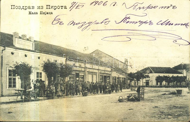 Pirot market square, restaurant, shops (fa) https://www.darabanth.com/de/414-Fernauktion/414.0/Ansichtskarten/Serbien~1500047/Pirot-market-square-restaurant-shops-fa~II582071