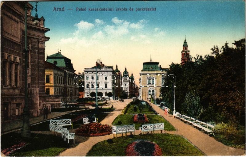 Beschreibung: 1915 Arad, Felső kereskedelmi iskola és park. Kerpel Izsó kiadása / school, park (EK)