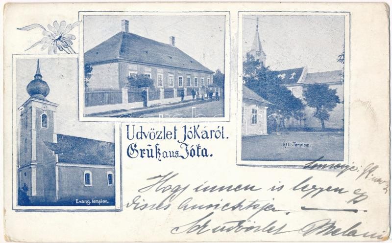 Beschreibung: 1899 (Vorläufer) Jóka, Jelka; Evangélikus templom, Katolikus templom, utca / Lutheran church, Catholic church, street view (kopott sarkak / worn corners)