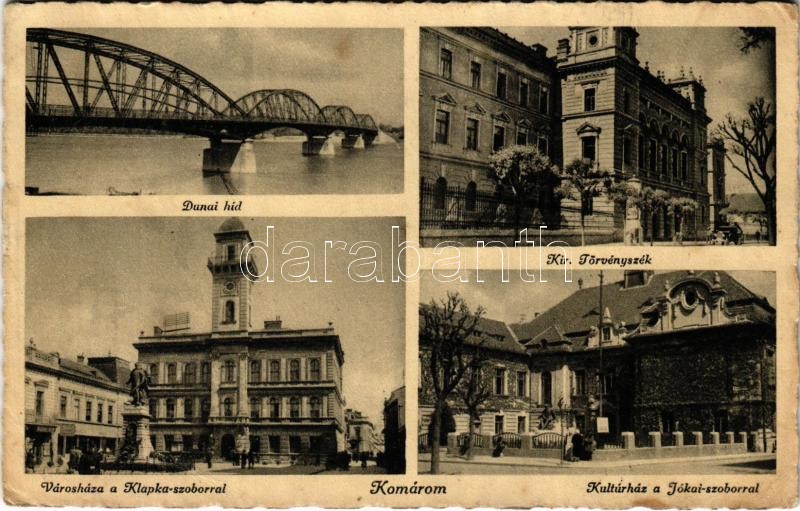 1939 Komárom, Komárno; Dunai híd, Kir. Törvényszék, Városháza, Klapka szobor, Kultúrház, Jókai szobor / Danube bridge, court, town hall, statue, community center (fl)