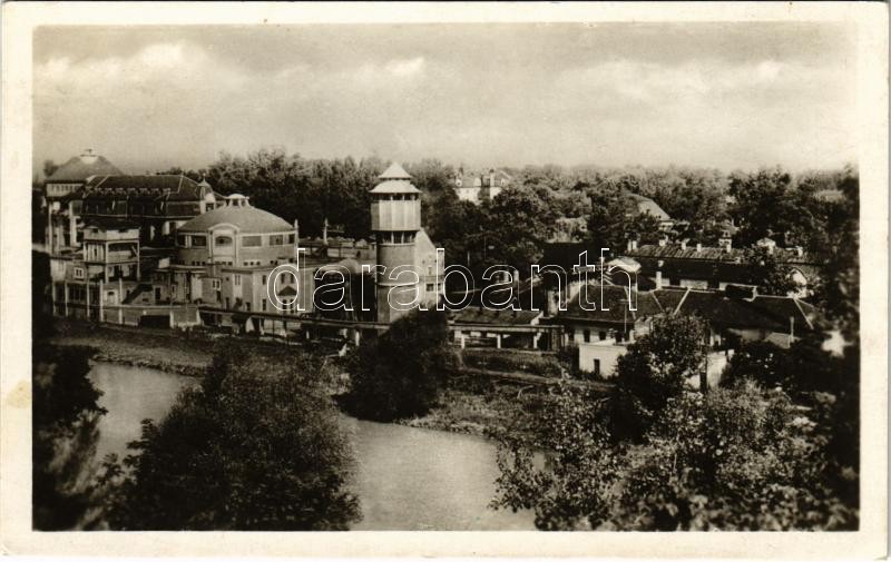 Beschreibung: 1950 Pöstyén, Piestany; Pohlad na kúpele a zriedlo s Radiového vrsku (cervená veza) / fürdő látképe, víztorony / spa, bath, water tower