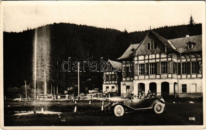 Beschreibung: Dobsina, Dobschau; Jégbarlangi szálloda, automobil. Fejér Endre kiadása / Hotel u ladovej jaskyne / hotel near the ice cave, automobile