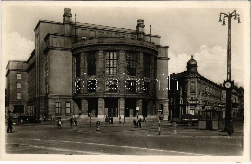 Pozsony, Pressburg, Bratislava; Jurist. Fakulte der Slowakischen Universität / Právnická fakulta Slov. univerzity / Szlovák Egyetem Jogi Kara, Hotel Carlton szálloda és kávéház, automobil / faculty of law, hotel and café, automobile