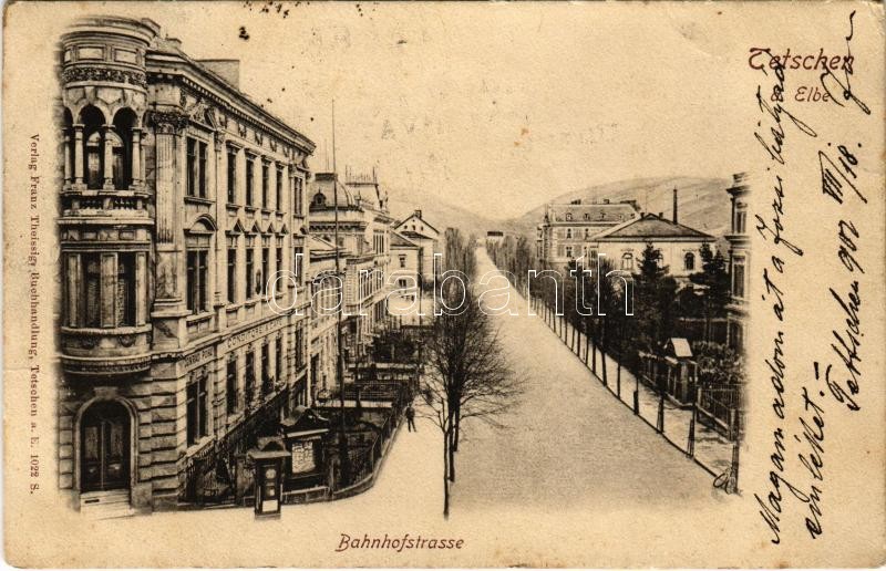 Beschreibung: 1902 Decín, Bodenbach, Tetschen; Bahnhofstrasse, Conrad Pohl, Conditorei & Cafe / street, shop, confectionery and cafe (EK)