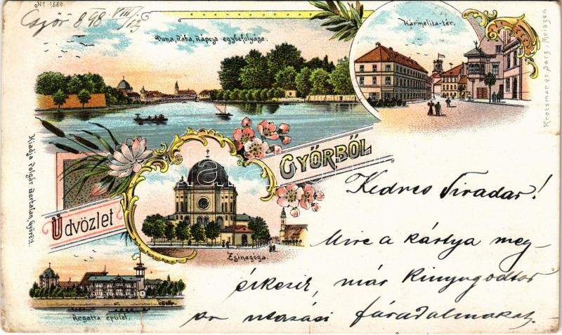 1898 (Vorläufer) Győr, Kármelita tér, zsinagóga, Regatta épület, Duna,... https://www.darabanth.com/de/414-Fernauktion/414.0/Ansichtskarten/Ungarn~1500003/1898-Vorlaufer-Gyor-Karmelita-ter-zsinagoga-Regatta-epulet-Duna-Raba-es-Rapca-egybe~II2592591