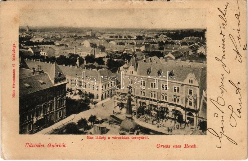 Beschreibung: 1899 (Vorläufer) Győr, Raab; Más látkép a városháza tornyáról, építkezés. Grassmann G. kiadása (ázott sarok / worn corner)
