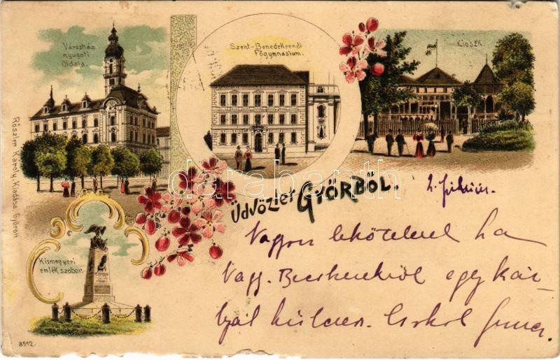 Beschreibung: 1899 (Vorläufer) Győr, Városháza, Szent Benedek rendi főgimnázium, Kioszk, Kismegyeri emlékszobor. Röszler Károly kiadása. Art Nouveau, floral, litho (szakadás / tear)