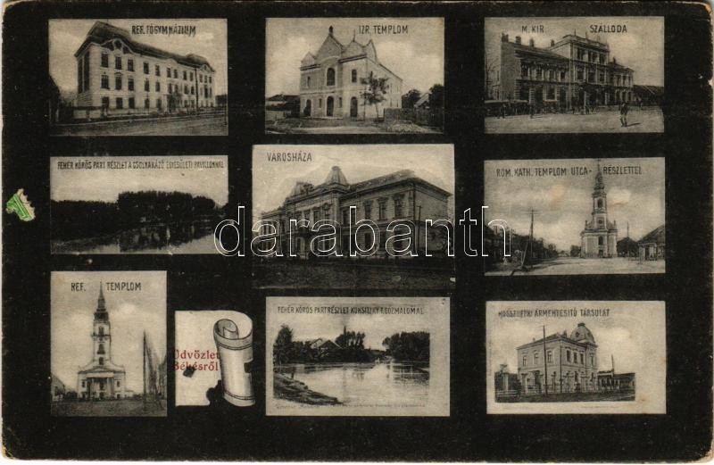 Békés, Református főgimnázium, Izraelita templom, zsinagóga, M. kir. szálloda, Fehér-Körös part részlet a Csónakázó Egyesületi pavilonnal és gőzmalommal, Városháza, Római katolikus templom, Református templom, Hosszúfoki ármentesítő társulat palotája. Végh Lajos kiadása (Rb)