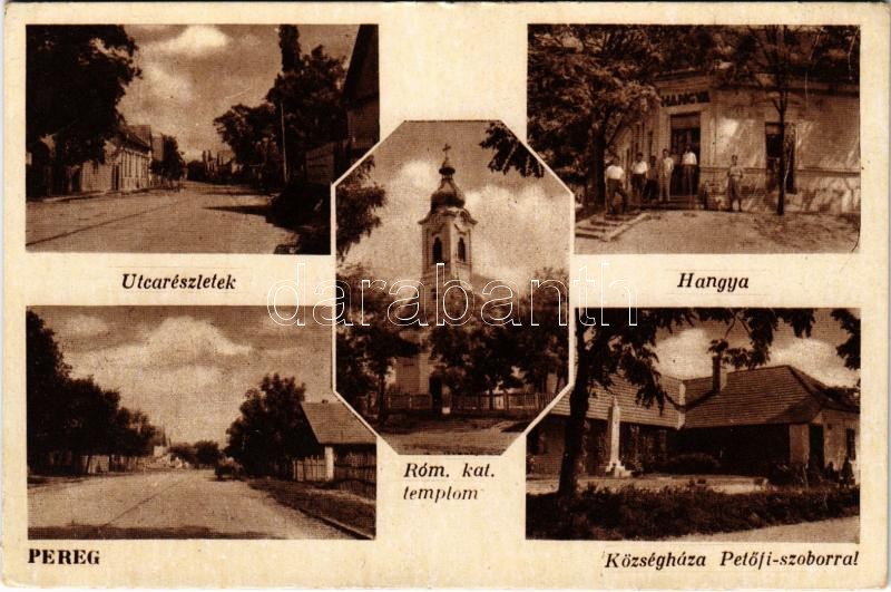 Pereg (Kiskunlacháza), utca részletek, Római katolikus templom, Községháza Petőfi szoborral, Hangya szövetkezet üzlete és saját kiadása (ázott sarkak / wet corners)