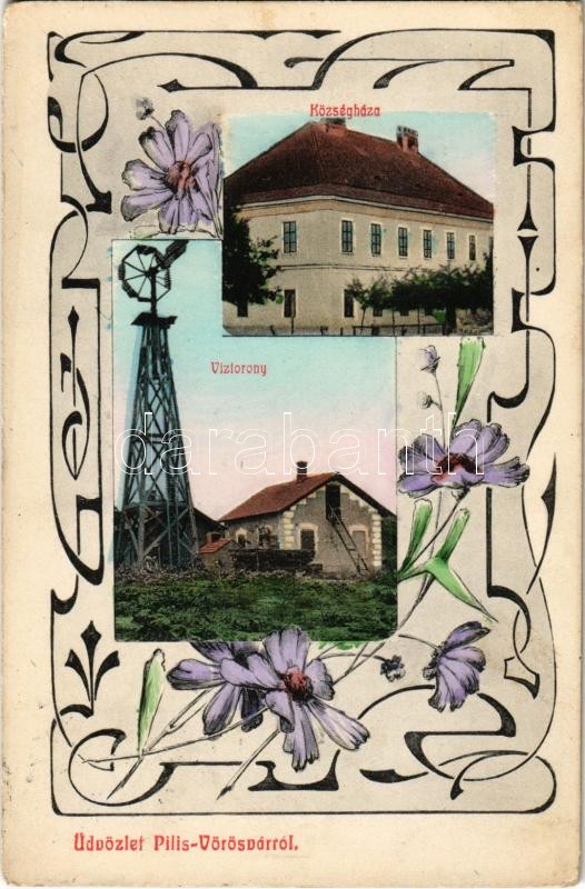 Pilisvörösvár, Községháza, Víztorony, szélmotor. Art Nouveau, floral (... https://www.darabanth.com/de/414-Fernauktion/414.0/Ansichtskarten/Ungarn~1500003/Pilisvorosvar-Kozseghaza-Viztorony-szelmotor-Art-Nouveau-floral-EK~II2593193