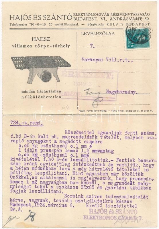 1934 HAESZ villamos törpe tűzhely. Hajós és Szántó elektromosgyár rész...