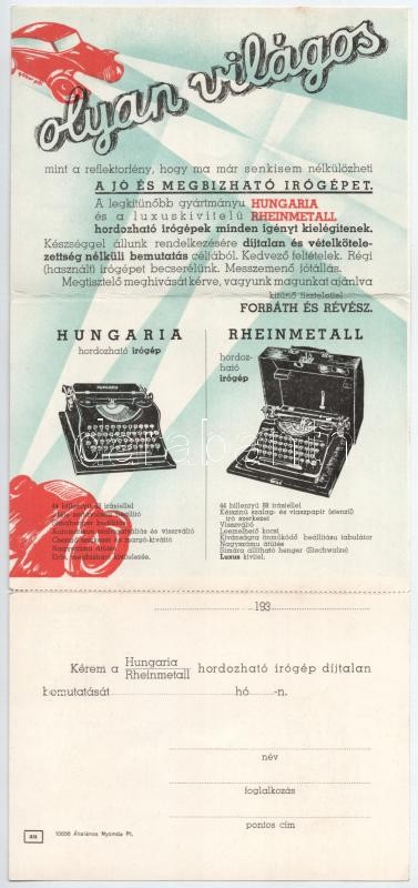 1936 Hungaria és Rheinmetall hordozható írógép. Forbáth és Révész cég kihajtható reklámlapja. Budapest V. Bálvány utca 26. / Hungarian typewriter shop folding advertisement card