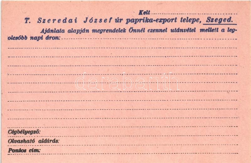 Szeredai József szegedi paprika export telep reklámlapja / Hungarian p... https://www.darabanth.com/de/414-Fernauktion/414.0/Ansichtskarten/Werbungen~1500077/Szeredai-Jozsef-szegedi-paprika-export-telep-reklamlapja-Hungarian-pepper-export-advertising-car~II2330551