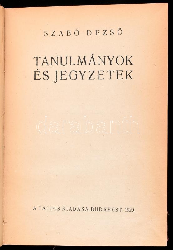 Szabó Dezső: Tanulmányok és jegyzetek. Bp., 1920, A Táltos kiadása, 151+1 p. Korabeli átkötött félvászon-kötés, kissé sérült borítóval, egy lapon kisebb szakadással.