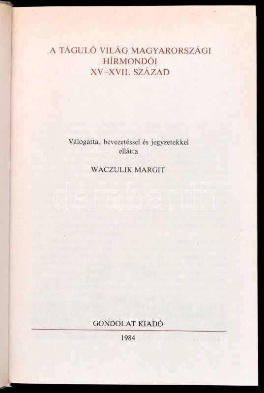 A táguló világ magyarországi hírmondói. XV-XVII. század. szerk: Waczul... https://www.darabanth.com/de/414-Fernauktion/414.0/Bucher/Bucher-Geschichte~1000010/A-tagulo-vilag-magyarorszagi-hirmondoi-XV-XVII-szazad-szerk-Waczulik-Margit-Bp-1984-G~II2588889