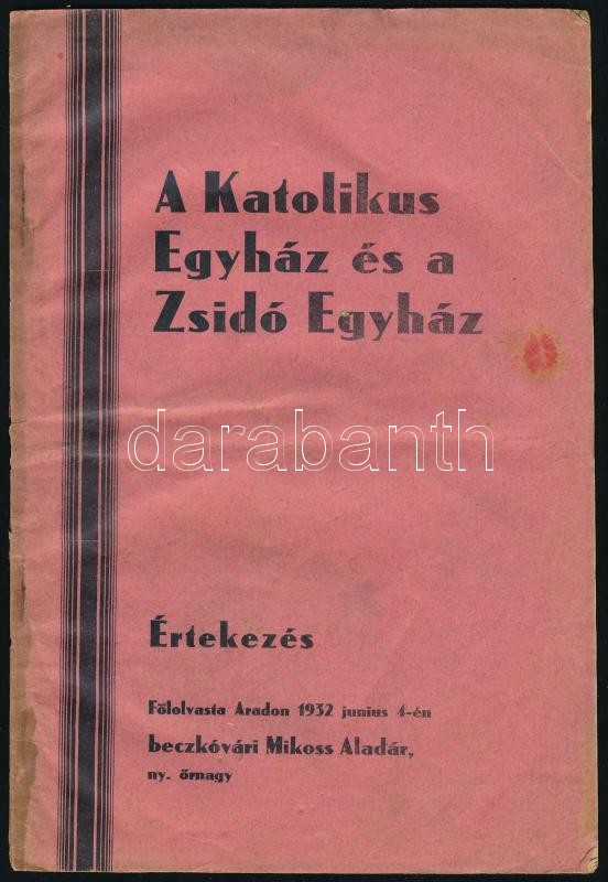 1932 A Katolikus Egyház és a Zsidó Egyház. Értekezés. Fölolvasta Aradon 1932. jún. 4-én beczkóvári Mikoss Aladár ny. őrnagy. Arad, (1932), Lovrov-ny., 24 p. Kiadói papírkötés, kissé gyűrött, foltos borítóval.