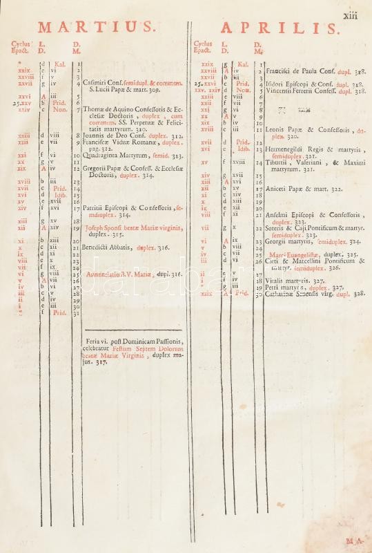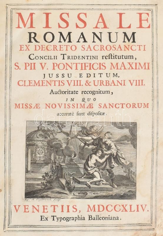 Missale Romanum ex decreto sacrosancti Concilii Tridentini restitutum, S. Pii V. Pontificis Maximi jussu editum, Clementis VIII. & Urbani VIII. Auctoritate recognitumm ... Venetiis, 1744, Ex Typ. Balleoiana, XXXV+1+460+XCIX+3+19-20+20 p. Korabeli egészbőr-kötésben, sérült, rossz, nagyon megviselt állapotban,(hiányos?)
