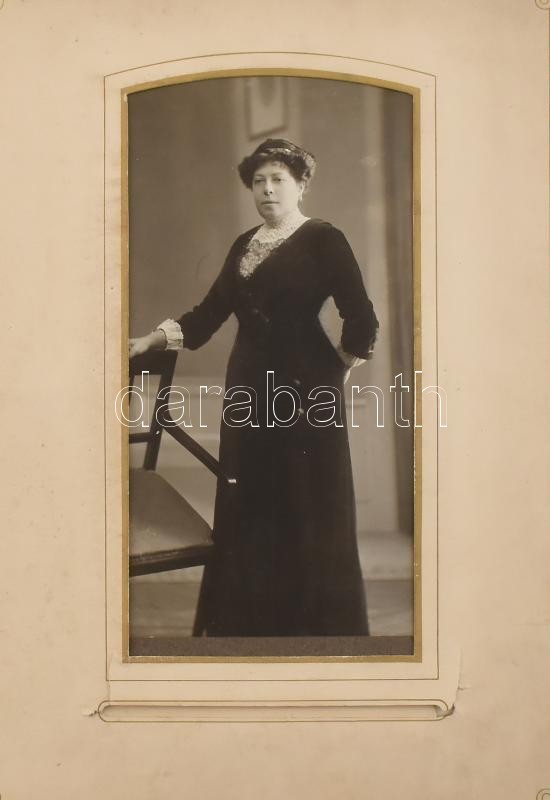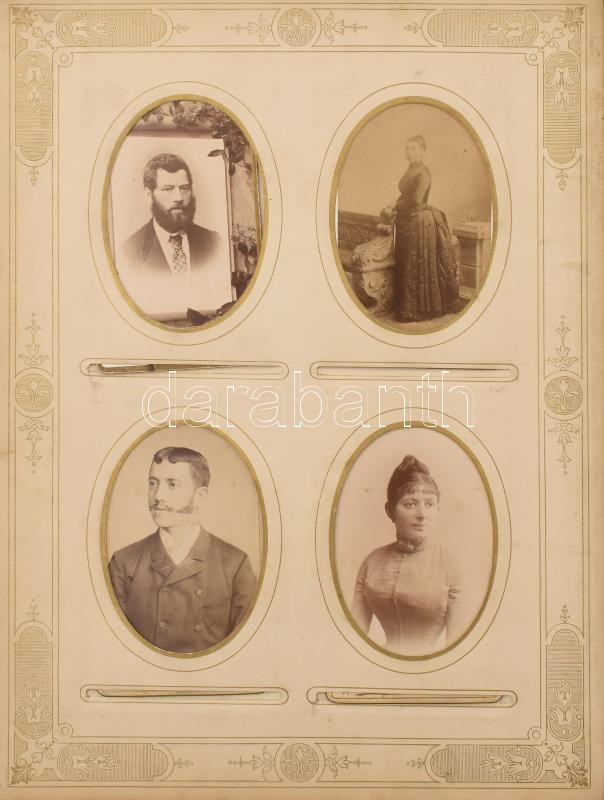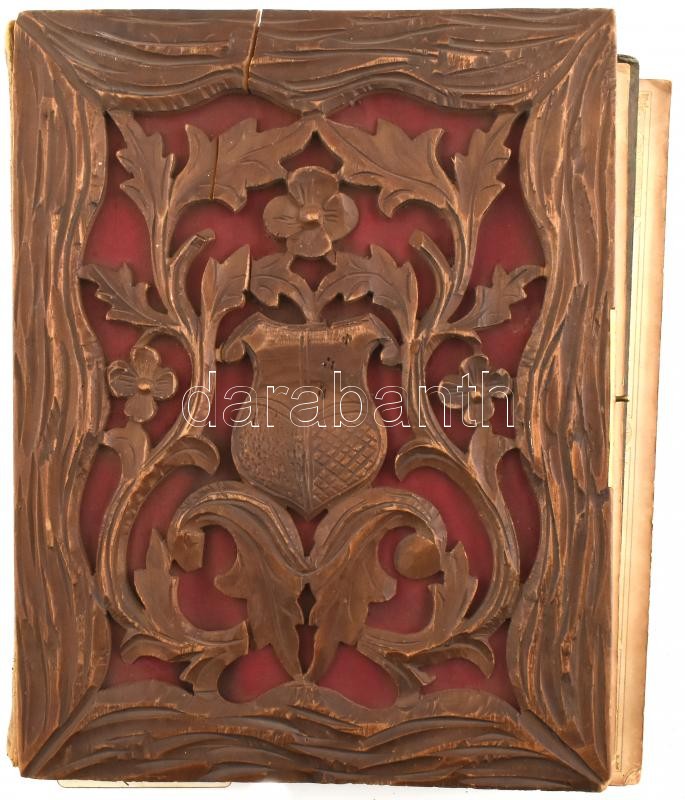 cca 1880-1920 Vegyes családi fotó hagyaték tétel, hozzá régi faragott fa borítású, sérült fotóalbum. Agnelli, Mai és Társa, Kozmata, stb fényképek., vizitkártyák, kabinetfotók kb 30 db