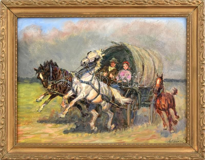 Beschreibung: Kolozsváry Kamilló (1936-2008): Lovaskocsi. Olaj, vászon, jelzett, fa keretben, 24×32 cm. Dekoratív fa keretben.